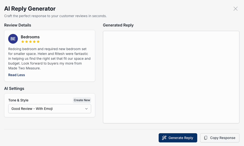 Our AI generates personalised reply suggestions that you can edit and approve, helping you respond faster, stay professional, and build loyalty without extra effort.